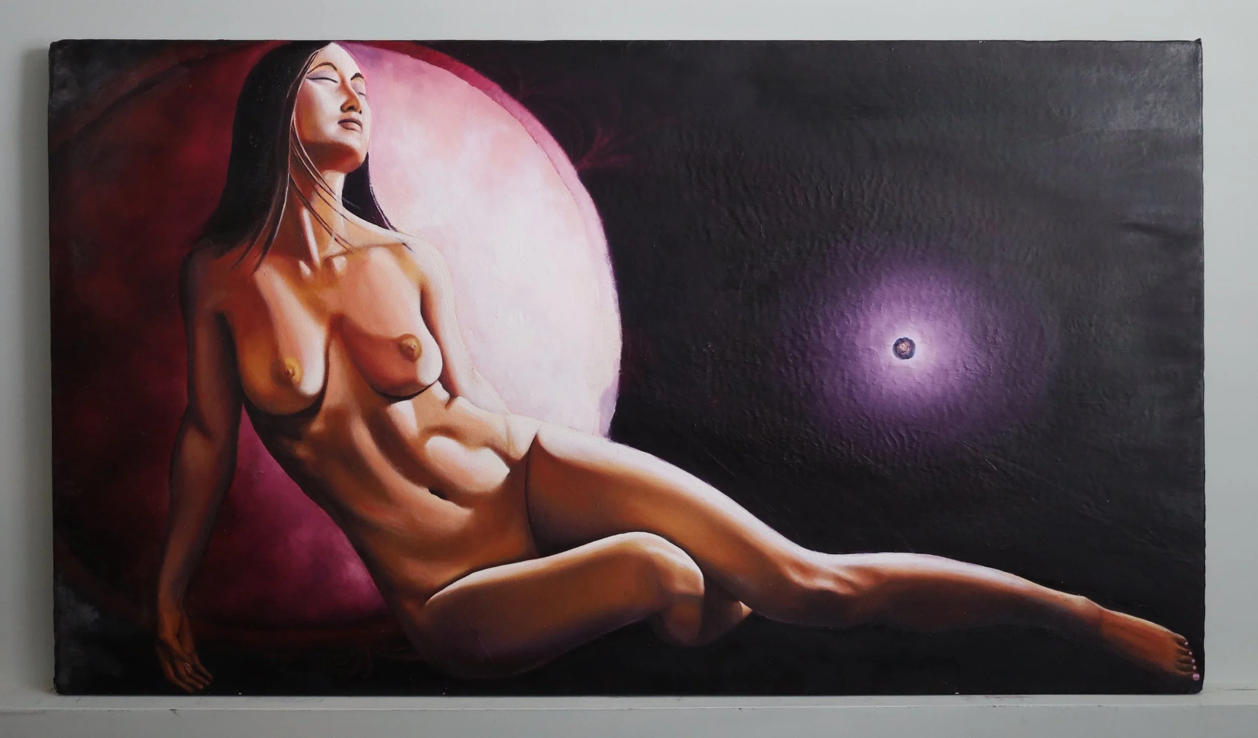 The artist delves into his passions in "Love Between Mercury and the Sun." This oil on canvas intertwines the realms of astronomy, astrology, the human form, and the intricacies of love. The artist’s poetry and introspection on relationships inspire this piece.